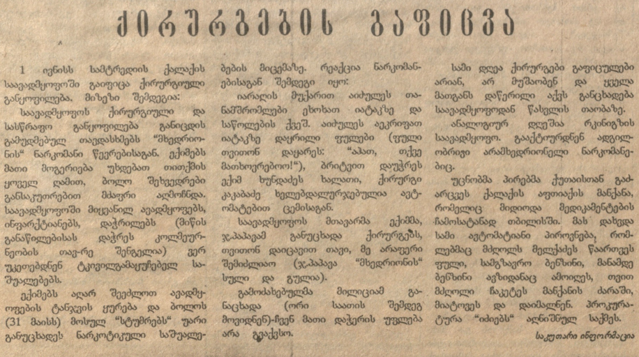 On June 1, 1992, the surgical department of the Samtredia hospital went on strike. According to the newspaper Tavisupali Sakartvelo (Free Georgia), the strike began after attacks by drug-addicted members of the paramilitary group Mkhedrioni became more frequent. As the press reported, they were seizing narcotic medicines from doctors, leaving no painkillers for patients.