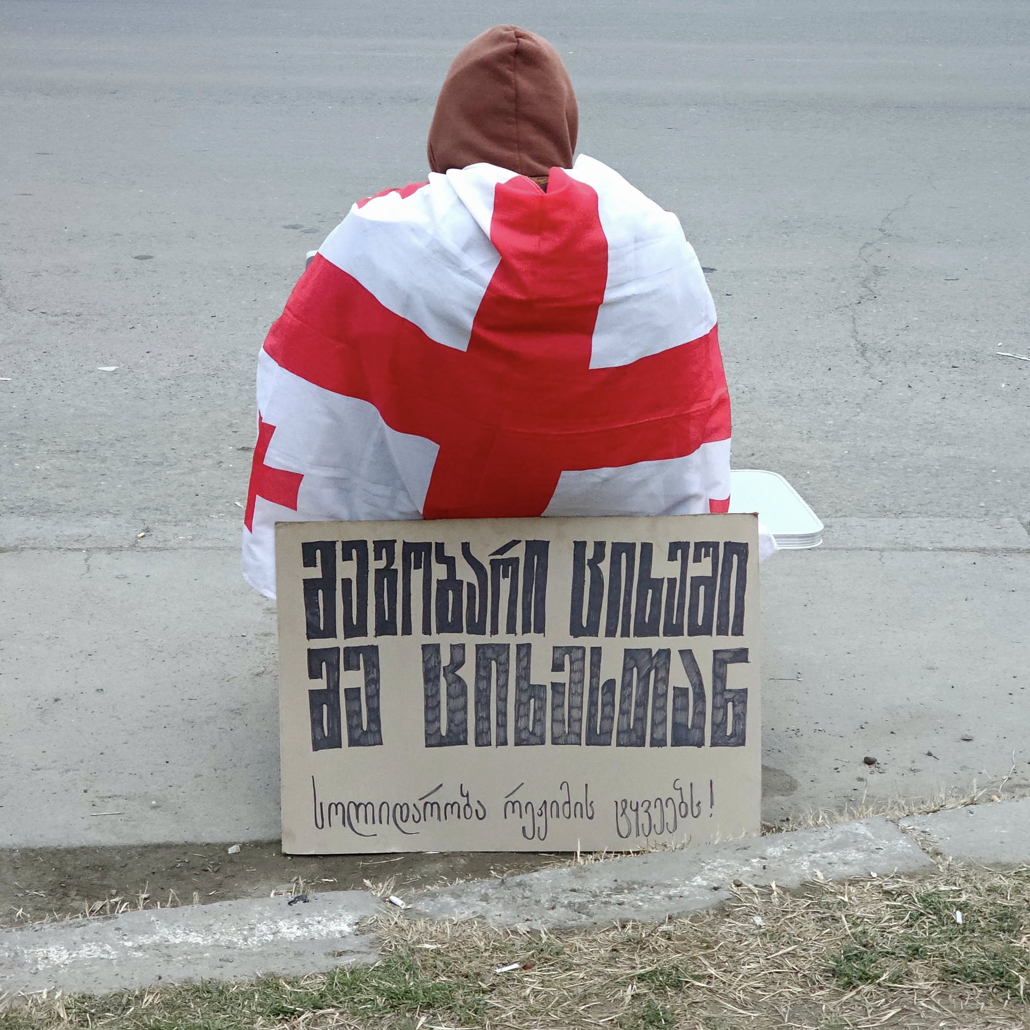 There were also solitary acts of protest. Humorist Onise Okriashvili held one-man rallies in public spaces, standing silently with a banner. Graphic designer Dato Simonia camped outside Gldani prison for 10 days—the exact duration of his friend’s administrative sentence. His banner read: “Friend in prison, me by the prison.” Eto Bichikashvili stood daily on Rustaveli Avenue, wrapped in a flag, positioned between two police cars that signaled the road closure.