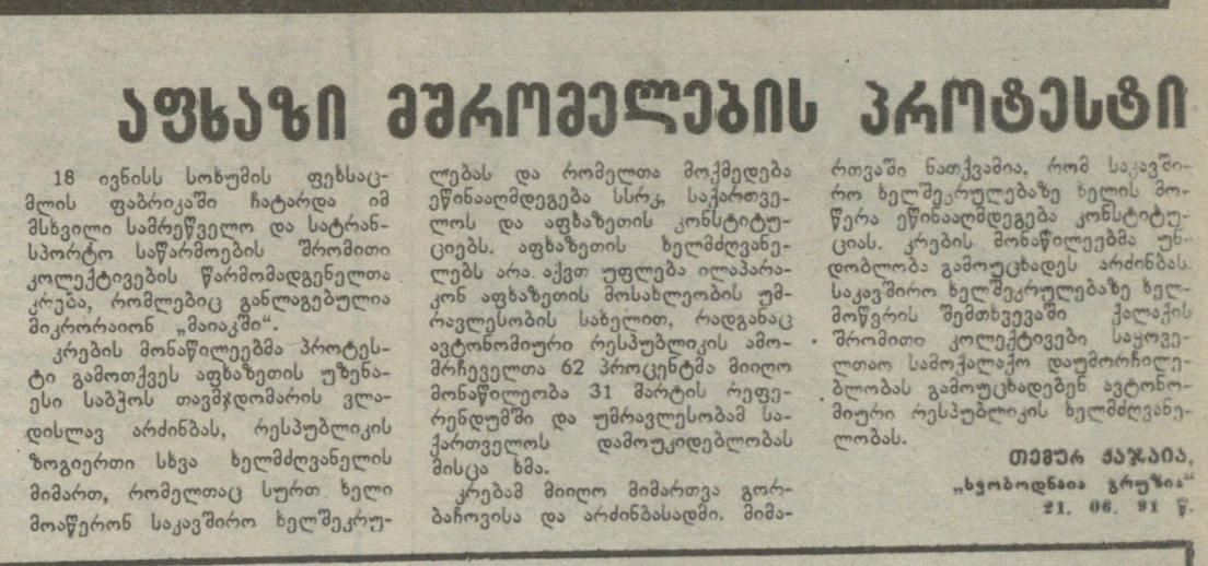 The workers developed an appeal to Gorbachev and Ardzinba. They also announced that they would declare civil disobedience if the union treaty were signed.
