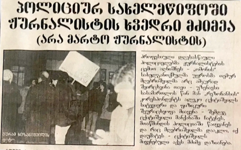 Outraged by the attack, journalists gathered outside the State Chancellery demanding Mgebrishvili’s dismissal and the disbandment of OMON. Their placards read: “President, protect journalists from violence!”, “No to a police state!”, and “Mgebrishvili to prison!” Equipped with whistles and horns, the protesters disrupted the routine of the Chancellery. The President’s press secretary, Vakhtang Abashidze, came out to negotiate, joined by senior officials Vaja Lortkipanidze, Mikheil Saakashvili, Zurab Zhvania, Rusudan Beridze, and Kakha Targamadze. Following the protest, President Eduard Shevardnadze ordered the Prosecutor General to open a criminal case against Temur Mgebrishvili for abuse of power. Later, the Ministers of Internal Affairs and Security signed a communiqué with representatives of the press and NGOs, pledging cooperation and mutual understanding.