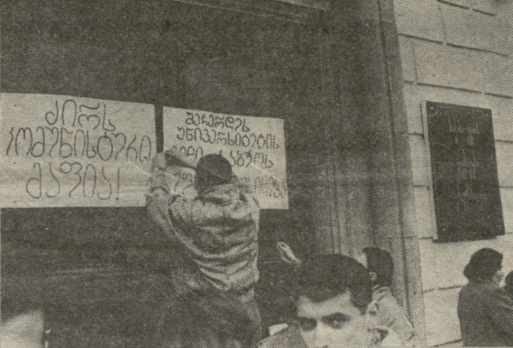 On February 18, 1991, a rally was held near the administrative building of the Georgian Technical University, organized by the Student Union. The participants dedicated this gathering to the events of February 18, 1989, when a student rally at the same university had been dispersed. That earlier rally addressed the tense situation between Georgians and Abkhazians and debated the existence of the Sukhumi branch of the Polytechnic Institute. The 1989 rally had been broken up by the militia, and according to newspaper reports, “Komsomol activists encouraged by the institute’s administration” also participated in the dispersal.
