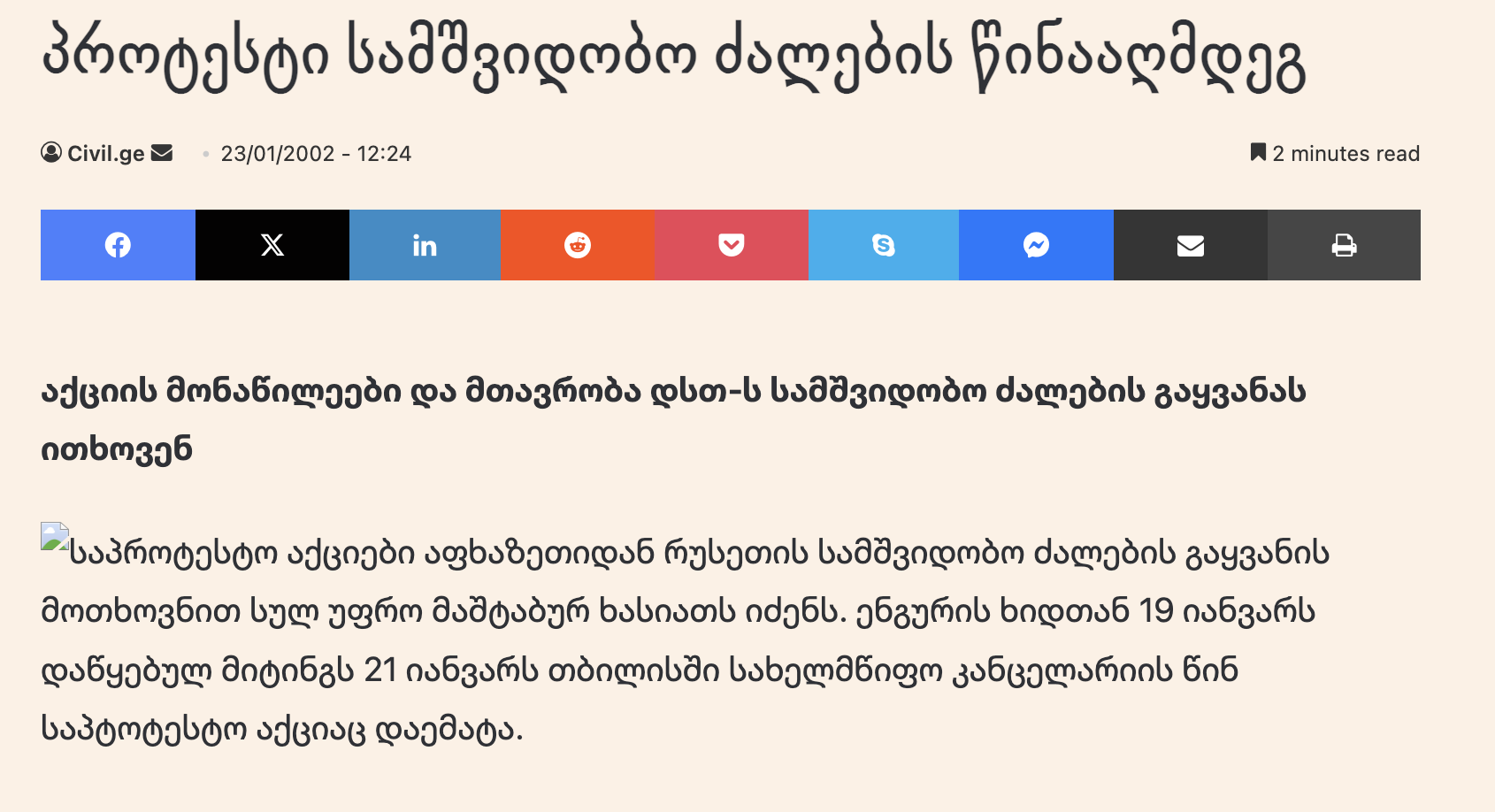 2002 წლის 19 იანვარს მოსახლეობა ენგურის ხიდთან შეიკრიბა და აფხაზეთიდან რუსეთის სამშვიდობო ძალების გაყვანა მოითხოვა. ამავე მოთხოვნით 21 იანვარს თბილისში სახელმწიფო კანცელარიის წინაც დაიწყეს საპროტესტო აქცია. აქციის მონაწილეებმა გადაკეტეს აფხაზეთში გადასასვლელი თითქმის ყველა ხიდი და გზა. ისინი უარს ამბობენ გაატარონ სამშვიდობო ძალებისა და გაეროს დამკვირვებლების კუთვნილი ტრანსპორტი. აფხაზეთიდან რუსეთის სამშვიდობო ძალების გაყვანის მოთხოვნით აქცია 2001 წლის ოქტომბერშიც გაიმართა. მაშინ პრეზიდენტი ედუარდ შევარდნაძე პროტესტის მონაწილეებს ამ მოთხოვნის შესრულებას დაჰპირდა, პარლამენტმა რუსი სამშვიდობოების გაყვანაზე დადგენილებაც მიღო, თუმცა 30 ნოემბერს შევარდნაძემ მის რუს კოლეგასთან, ვლადიმერ პუტინთან მოსკოვში გამართული შეხვედრის შემდეგ, უეცრად შეიცვალა პოზიცია და განაცხადა, რომ იგი რუსი სამშვიდობოების აფხაზეთიდან გასვლის დაჩქარებას არ ემხრობა. მომიტინგეთა მოთხოვნებს იზიარებდნენ ხელისუფლებაშიც, თუმცა როგორც საქართველოს უშიშროების მინისტრმა 21 იანვარს განაცხადა, “ეს არის პრობლემა, რომელიც ერთ ან ორ დღეში ვერ გადაწყდება და მას წლები სჭირდება”. მოგვიანებით აქციის მონაწილეთა მოთხოვნებს შეემატა პროტესტი კოდორის ხეობიდან საქართველოს თავდაცვის სამინისტროს ძალების გამოყვანის გადაწყვეტილებასთან დაკავშირებითაც.