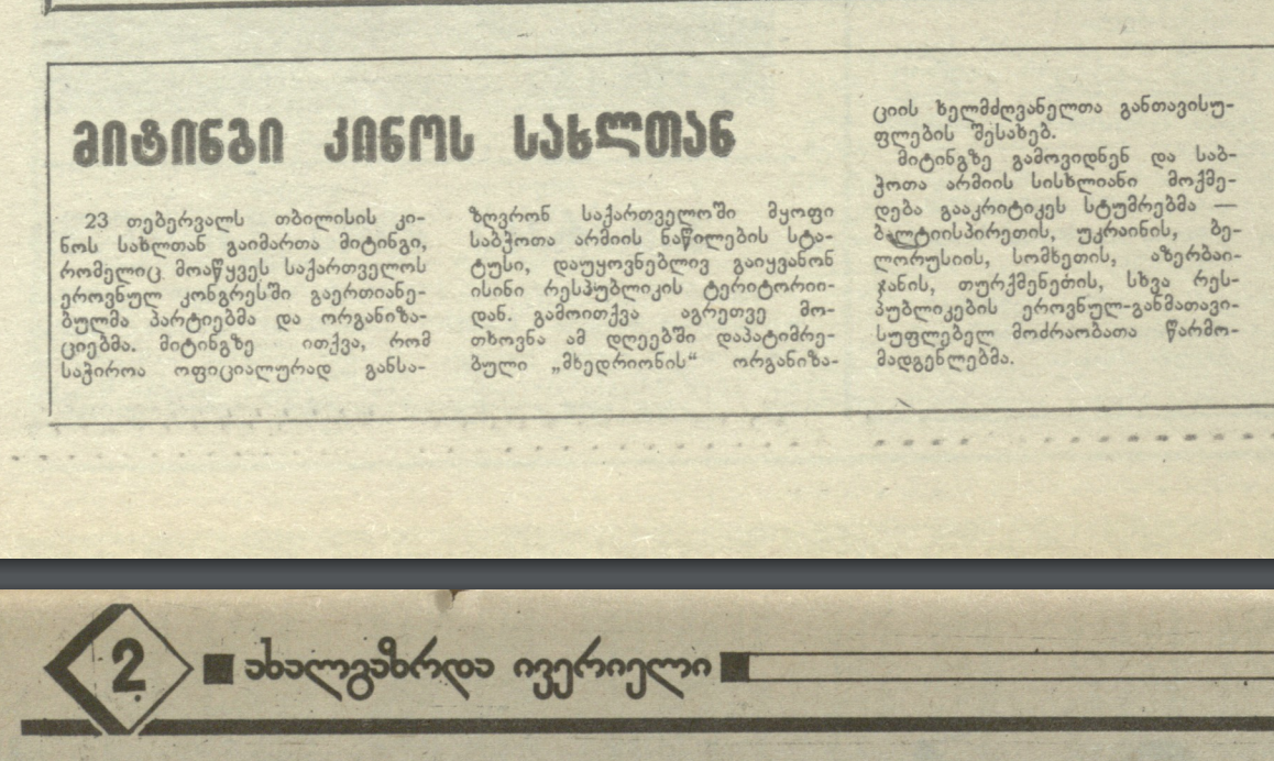 23 თებერვალს კინოს სახლთან გამართულ მიტინგზე გაიმართა აქცია საქართველოს ტერიტორიიდან საბჭოთა არმიის გაყვანის მოთხოვნით. მიტინგზე სიტყვით გამომსვლელებმა მეორე მოთხოვნაც დააყენეს – გათავისუფლდნენ წინა დღეებში დაპატიმრებული “მხედრიონის” ხელმძღვანელები. საბჭოთა არმიის მოქმედებები გააკრიტიკეს მიტინგზე მისულმა სტუმრებმა ბალტიისპირეთის, უკრაინის, ბელორუსიის, სომხეთის, აზერბაიჯანის, თურქმენეთის და სხვა რესპუბლიკების ეროვნულ-განმათავისუფლებელი მოძრაობებიდან. მომიტინგეები კინოს სახლიდან მთავრობის სახლთან (ახლანდელი პარლამენტის შენობა) მივიდნენ.
