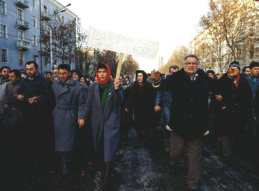 მშვიდობიანი საპროტესტო მსვლელობა, ტრაფარეტით ხელში საქართველოს ეროვნულ-განმათავისუფლებელი მოძრაობის წევრი კლარა შუკვანი, 1992 წლის იანვარი