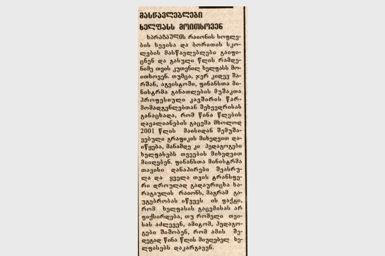 2001 წლის თებერვლის დასაწყისში ხარაგაულის რაიონის სოფლების ხევისა და ბორითის სკოლის მასწავლებლები გაიფიცნენ. ისინი გასული წლის რამდენიმე თვის სახელფასო დავალიანების მიღებას მოითხოვდნენ. თუმცა ჯერ კიდევ წინა წლის აგვისტოში ფინანსთა მინისტრს განათლების მუშაკთა პროფესიული კავშირის წარმომადგენლებთან შეხვედრისას ჰქონდა ნათქვამი, რომ წინა წლის დავალიანება 2001 წლის მაისიდან გრაფიკის მიხედვით გადაირიცხებოდა, მანამდე კი პედაგოგები მიმდინარე თვეების ხელფასს მიიღებდნენ. მართლაც ყოველ თვე იღებდნენ ხელფასს, მაგრამ გაუგებრობას იწვევდა ის ფაქტი, რომ ხელფასის გაცემისას არ ფიქსირდებოდა რომელი თვის ხელფასს იღებდნენ, ამიტომ შიშობდნენ, რომ წინა წლის მიუღებელ ხელფასს დაკარგავდნენ.