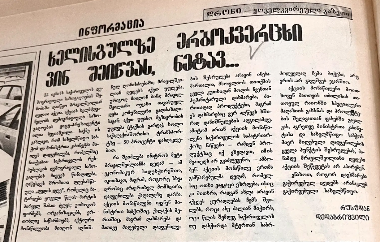 “მართალია მსოფლიოს თითქმის ყველა კუთხიდან მოდის ჩვენთან ჰუმანიტარული დახმარება, ძირითადად, პროდუქტები, მაგრამ ეს დახმარებაც ვერ აღწევს ხშირად დანიშნულების ადგილამდე. ამიტომ არიან აქციის მონაწილენი საქართველოს საპატრიარქოზე ნაწყენი – რამდენ პროდუქტსაც იქ ვხედავთ, იმის მეათედს არ გვაძლევენო, ამბობენ”, – წერს გაზეთი “დრონი”.