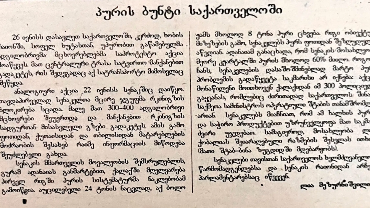 1993 წლის ივნისში საქართველოში პურის ბუნტი დაიწყო. უპურობის გამო ხალხმა პროტესტი დაიწყო. 22 ივნისს სენაკში მცირე ჯგუფმა რკინიგზის ბლოკირება სცადა, მალე მათ 300-400 ადგილობრივი მცხოვრები შეუერთდა და რკინიგზის სადგურთან მისასვლელი გზები გადაკეტეს. სენაკის მმართველის მოვალეობის შემსრულებელმა გურამ ადამიამ თქვა, რომ ქალაქში მღელვარება პურის სისტემატურმა ნაკლებობამ გამოიწვია: აუცილებელი 24 ტონის ნაცვლად, მხოლოდ 8 ტონა პური ცხვებოდა. სენაკელებს პურს ფოთიდან შეზღუდულად აწვდიდნენ. აქციის მონაწილეები ასევე ითხოვდნენ ქალაქიდან 300 პოლიციელის გაყვანას. სენაკელები ამბობდნენ, რომ მათი უზრუნველყოფა პურითა და საჭირო პროდუქტებით ძვირი უჯდებათ.
