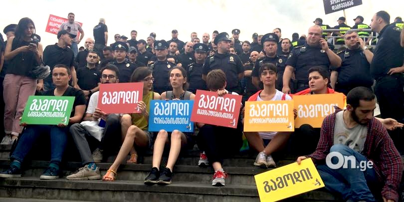14 ივნისს საღამოს კანცელარიასთან მისულ აქტივისტებს ჰომოფობიური ჯგუფები და პოლიციელები დახვდნენ. მათი თქმით, პოლიციამ კანცელარიის წინ აქციის გამართვის უფლება არ მისცა, ამიტომ საპროტესტო შეკრებამ კიბეებზე გადაინაცვლა, სადაც მათ აგრესიული ჯგუფებისგან ასეულობით პოლიციელი ყოფდა. “გამოდი სიყვარულისთვის”; “გამოდი ღირსებისთვის”; “გამოდი თავისუფლებისთვის”; “გამოდი ღირსებისთვის” – ამ წარწერებიანი ბანერებით ისხდნენ კიბეებზე აქტივისტები.