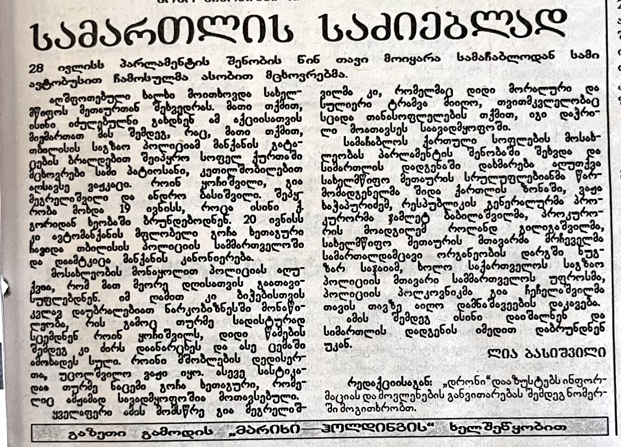 1994 წლის 28 ივლისს პარლამენტის შენობის წინ შეიკრიბნენ სამაჩაბლოდან ჩამოსული ათასობით ადამიანი. აღშფოთებული ხალხი მოითხოვდა სახელმწიფო მეთაურთან, ედუარდ შევარდნაძესთან შეხვედრას. აქციის მონაწილენი ამბობდნენ, რომ იძულებულნი გახდნენ, აქცია გაემართათ, რადგან 19 ივნისს თბილისის საგზაო პოლიციამ მანქანის გატაცების ბრალდებით დააკავა სოფელ ქურთაში მცხოვრები სამი “პატიოსანი, კეთილშობილებით აღსავსე ვაჟკაცი” – როინ ყოჩიაშვილი, გია მეგრელიშვილი და ანდრო ბასიშვილი. მეორე დღეს თბილისის პოლიციის სამმართველოში ჩავიდა მანქანის მესაკუთრე გოჩა ხეთაგური და დაამტკიცა, რომ მანქანა არავის გაუტაცია.